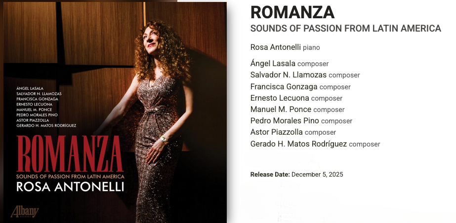 This program has been selected by Rosa Antonelli, a pianist who has championed repertoire from Latin America, particularly from her homeland of Argentina — often resurrecting little-known jewels. Antonelli, a Steinway Artist since 1998, is one of today’s leading performers, who has toured extensively, with more than 1,000 concerts in Europe, Africa, Asia, Latin America, and North America to her credit. Her three previous recordings on Albany Records have received rave reviews from critics.